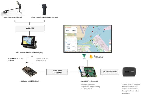Furthermore, the ESP8266 Wi-Fi module [,,] was chosen for its ability to establish a dependable serial connection with the Raspberry Pi [,], enabling the retrieval of NMEA data from the plotter. Its compatibility with serial communication protocols and compact form factor makes it a suitable component for integration into the system architecture. This hardware system has the potential to develop a low-cost solution that does not compromise functionality or performance.