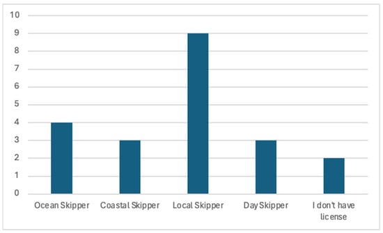 Figure 12 illustrates their licensing credentials. The chart displays the licenses held by the participants: two participants (n = 2) did not have a license, four (n = 4) held an ocean skipper license, three (n = 3) held a coastal skipper license, nine (n = 9) held a local skipper license, and three (n = 3) held a day skipper license. These licenses provided this study with information about their maritime ability. Each category represents a distinct level of nautical competence, acquired through training, experience, and adherence to safety protocols. The diversity of licenses reflects the varied roles these individuals play within the maritime ecosystem.