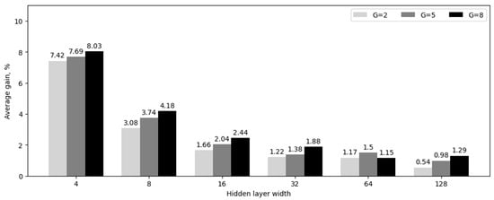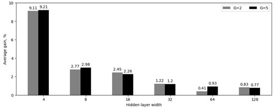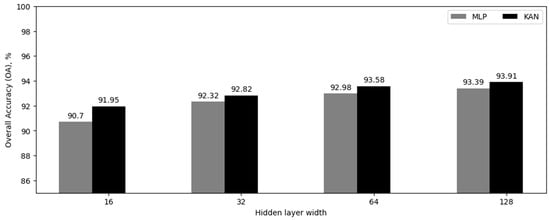 Table 5) indicated that KANs exhibited superior classification quality metrics in comparison to conventional MLPs. We did not identify an obvious dependence of the classification accuracy on the G parameter. For this reason, we gave preference to KAN networks with small values of the G parameter (2, 5) since they had fewer parameters. On the other hand, increasing the number and size of layers led to a slight increase in the classification quality. For instance, the maximal average accuracy for KAN without hidden layers was 89.95%. The KAN with one hidden layer achieved 91.53%, while with two hidden layers, it attained 92.05%. It is worth noting that an increase in the number of neurons in the hidden layers resulted in a reduction in the average accuracy gain relative to MLP since the accuracy of MLP increased. During the experiments, it was found that utilizing batch normalization before hidden layers, which stabilizes training and improves the generalization ability of classifiers, allows achieving an accuracy of 93.91%.