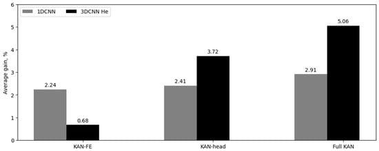 Table 7) indicate that replacing traditional blocks with their KAN analogs consistently enhances classification quality. Specifically, the replacement of both the feature extractor block and the classification block yields the best results, with improvements of 2.91% for 1D-CNN and 5.06% for 3D-CNN He. For 1D-CNN, substituting either the feature extractor block or the classifier block results in average quality increases of 2.24% and 2.41%, respectively. In contrast, for 3D-CNN He, replacing only the classifier block produces a more substantial improvement—3.72%—compared to replacing only the feature extractor block, which results in a 0.68% increase. Thus, it can be concluded that for deeper networks, both blocks should be replaced, while for shallower networks, replacing just one of them is sufficient.
