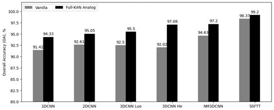 The primary trends observed in classical architectures are also evident in their KAN counterparts. For instance, 2D-CNN KAN outperforms 1D-CNN KAN by an average of 0.72%, NM3DCNN KAN surpasses 2D-CNN KAN by 2.15%, and SSFTT KAN is 2% better than NM3DCNN KAN. The highest classification accuracy of 99.2% is achieved by the SSFTT KAN transformer network. Notably, the f-measure results generally support these conclusions based on classification accuracy.