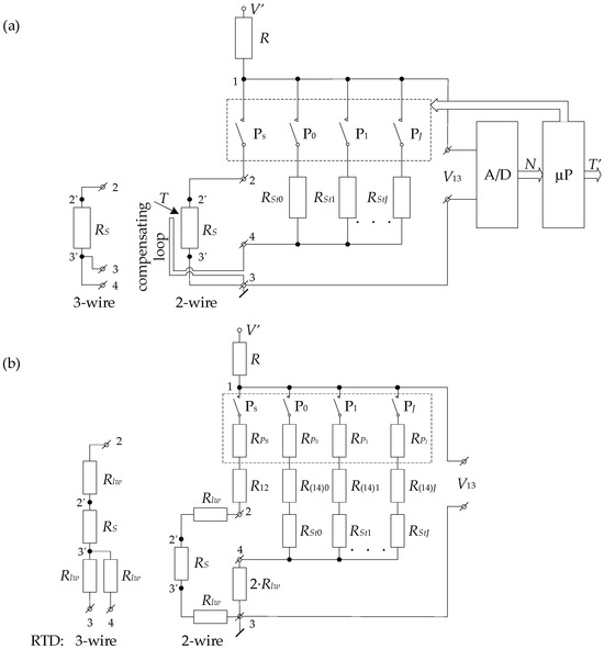 - An auto-calibration circuit, powered by a voltage source V′ through a resistor R, containing standard resistors (from RSt0 to RStJ): These resistors are switched on accordingly by switches (P0…PJ). The number of standard resistors and their resistance values depend on the adopted degree (J) of the polynomial describing the processing characteristics of the entire measurement circuit (Figure 1), as discussed further in this section. A compensation loop is included in series with the standard resistor RStj (j = 0…J) between points 3 and 4, whose task is to compensate the sum of the connection line resistance between points 2–2′ and 3–3′ (resistance of the RTD sensor wires) [28]. The V13_Stj voltage value is determined by the equation