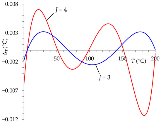 - A polynomial of degree J = 3 was chosen for further research. For this polynomial, the error values of the presented ITT were smaller than those obtained for the transducer described in [13] (Figure 2) for J = 4 (ΔT ∈ (−0.011, 0.007) °C). Adopting such a solution (J = 3) allowed simplifying the auto-calibration circuit in the ITT, easier implementation of the auto-calibration procedure in μP, and shortening the running time of the procedure.