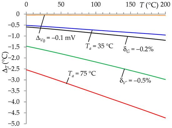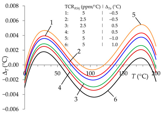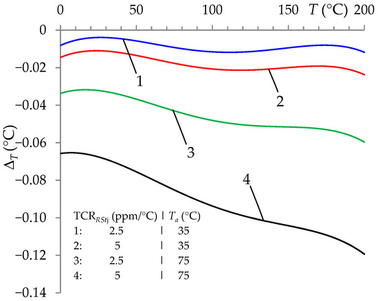 In the second case, T measurement errors were analyzed using the auto-calibration procedure under the same conditions as in the first case. The proposed procedure effectively reduced the ΔT error value in the case of the influence of the ambient temperature Ta on the resistor R. For Ta = 75 °C, the ΔT error in the entire measurement range T, from 0 to 200 °C, varied within the range of −0.0025 °C to 0.0032 °C.