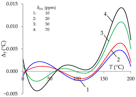 where V13 takes the value of V13_S or V13_Stj, respectively; δINL is the limiting linearity error; and VADmax is the range of the A/D converter. Figure 6 shows the influence of δINL on the temperature T measurement error. The results of this test indicated the possibility of achieving the T measurement error below 0.01 °C with a linearity error δINL less than 50 ppm.