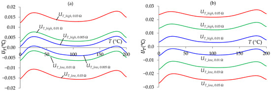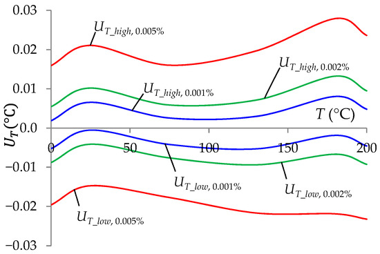Figure 7 presents the test results in the form of temperature measurement uncertainty intervals (UT_low, UT_high) as a function of the temperature measured for selected accuracies of the standard resistors. The obtained results indicated that achieving high accuracy in temperature measurement required the use of resistors with values known with high accuracy. For example, achieving T measurement uncertainty of approximately ±0.01 °C required the use of standard resistors with values known with an inaccuracy not greater than ±0.002%.