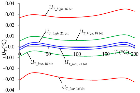 Figure 9 shows the results of simulation tests determining the impact of the A/D converter resolution on the temperature T measurement uncertainty. The results of these tests indicated the possibility of achieving the T measurement expanded uncertainty at the level of ±0.01 °C using an A/D converter with a resolution of 18 bits.