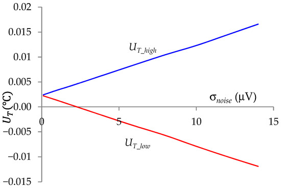 The study of the influence of Gaussian noise with standard deviation σnoise on the uncertainty of a single measurement T is illustrated in Figure 10. These were the results for the measurement case T = 180 °C, for which the highest uncertainties were obtained. This figure shows that it was possible to achieve T measurement uncertainty below ±0.01% with a standard deviation of noise less than 10 µV. It should be emphasized that for noise, the measurement uncertainty (resulting from the scatter of results) could be reduced by averaging a larger number of T measurements and/or using RC filters before the A/D converter [15].