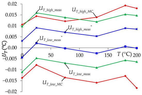 The results of the calculated measurement uncertainties are presented in Figure 11. The experimentally obtained limit values in the entire range of measured temperatures did not exceed the values UT_low_meas_min = −0.012 °C and UT_high_meas_max = 0.016 °C. These were the values that did not exceed the limit values obtained by simulation. This indicated a high agreement between the simulation and the experimental results. It is worth noting that the error ΔT_set = 0.01 °C had a large impact on the measurement uncertainty results (UT_low_meas, UT_high_meas). If this component was not considered in the measurement uncertainty calculations ((21), (22)), then the obtained uncertainty values (UT_low_meas*, UT_high_meas*) were much smaller than the uncertainties determined by simulation (Figure 11) in the entire range of the measured temperature.