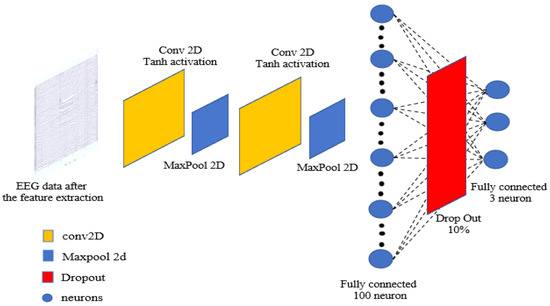 In addition to the empirical error model, the feature extraction process is carried out, which helps in making the data more discrete for each class and thus increases the classification accuracy. The 16 features are extracted collectively from all eight EEG channels at specific data points rather than from each channel individually. This extraction is event-based, not tied to a time window, task, or trial. Mobility, complexity, kurtosis, mean, max, coefficient of variation, skewness, wavelet detailed energy, wavelet detailed entropy, variance, FFT delta max power, FFT theta max power, FFT alpha max power, and FFT beta max power are the key features extracted from the EEG data. Delta, theta, alpha, and beta are the major frequency level features which are used in clinical analysis. The strength of these bands in a person’s EEG data are also related to his/her emotional and mental state. Kurtosis, mean, and variance are standard statistical tools normally used in classification algorithms. Although feature extraction is typically part of CNN modeling, our dataset shows high variability, making it challenging to achieve accurate results with direct data input. By performing explicit feature extraction, we provide a more stable, representative dataset that improves classification accuracy. After feature extraction, there are 10,000 data samples for each class and 30,000 in total. This is the final training data that are given to the proposed CNN model. Here, “samples” refer to instances of data taken at 5-s intervals, with each sample containing feature information derived from the EEG and accelerometer data.