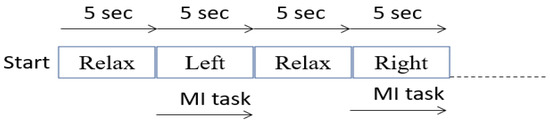 Motor imagery EEG data were recorded using the 8-channel OpenBCI Cyton board 230 (Brooklyn, NY, USA), which is shown in Figure 3. The OpenBCI Cyton board plays a crucial role in data collection by serving as the primary interface for capturing and digitizing EEG signals. Key components of the Cyton board include the ADS1299 Analog Front End, which is responsible for high-resolution EEG signal acquisition, and the PIC32MX250F128B microcontroller, which processes the data. The board also features an RFduino BLE radio for wireless data transmission and an LIS3DH 3-axis accelerometer for motion detection. The Cyton board operates in conjunction with the OpenBCI GUI software (Version V5.0.0), which facilitates real-time data visualization and recording. This software allows users to configure the board, monitor signal quality, and save data for further analysis. The integration of the Cyton board with the OpenBCI GUI ensures a seamless workflow for brain–computer interface (BCI) applications, enabling efficient and accurate data collection. Each time a motor action is shown on the screen, the user must mentally perform the action without any overt movement or without any peripheral (muscle) activation. During each recording session, the subject is given two motor imagery tasks to perform—right and left-hand movements, each for 5 s. The recording session involves the following steps: