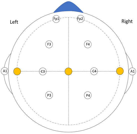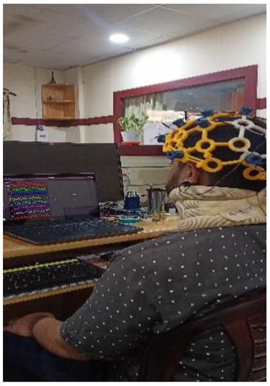 For this data recording session, the subject was seated at a computer table with a laptop placed 50–60 cm away in a well-lit room without any noise disturbances. Each subject wore a neck band to reduce the artifacts caused by any jerk or head movement. They were also instructed not to make sudden body, eye, and head movements to minimize the effect of electromyography (EMG) signals from the data. The EEG data, along with the accelerometer data, were recorded during this recording. These data were the main reference data with which the empirical model calculated the error. The EEG electrodes were placed in Fp1, Fp2, F3, F4, C3, C4, P3, and P4 as shown in Figure 5. These positions were maintained in all the recording sessions throughout the experiment for each of the subjects. Figure 6 shows the experimental setup for reference data recording.