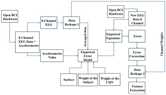 The empirical model is formulated based on the reference EEG data and accelerometer data. Figure 7 shows the proposed empirical error model architecture in detail. The subject wears a cap equipped with the OpenBCI Cyton board. EEG electrodes attached to the cap capture brain signals and transmitted them to the Cyton board. The board digitizes these signals and sends the data via USB to a connected laptop. The OpenBCI GUI software on the laptop facilitates real-time data visualization and initial processing. After this, the data are passed to a Python script for further processing and error modeling. All data, including EEG recordings and accelerometer measurements, are transmitted to a laptop via USB. The laptop serves as a temporary storage location, holding the data only briefly for real-time processing. The system does not retain data long-term, focusing instead on immediate analysis and real-time processing using machine learning algorithms without permanent data storage. Finally, the processed data are fed into a Convolutional Neural Network (CNN) for analysis. The ‘error’ in this context refers to the difference between the baseline reference data (collected in a controlled, standard environment) and the live data recorded while the wheelchair is in motion across different terrains. The empirical model can be divided into the accelerometer error model and the 8-channel EEG error model. Both these models use the same reference EEG data and the EEG motion data, which is explained in Section 5. In the Data Reshape 1 block, the 8-channel EEG data are converted to a single channel value by averaging the (E_avg) data from all channels. In addition to averaging, the weights of all channels are calculated. These single channel data go to the empirical model for noise removal. The Data Reshape 2 block converts the empirical model output (filtered data) into 8-channel data using the weights obtained in the Data Reshape 1 block.