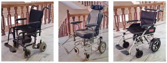 For recording EEG data in motion, three different powered wheelchairs are designed and implemented, as shown in Figure 8, which are powered by Raspberry Pi 3 (Raspberry Pi Ltd., Cambridge, UK). One of the three wheelchairs has a 350 W, 24 V, geared PMDC motor with rubber tires and weighs 90 Kg. The remaining two have 250 W, 24 V geared DC motors with similar rubber tires and weigh 80 Kg and 25 Kg, respectively. As mentioned earlier, five subjects took part in this data recording session. The wheelchairs are teleoperated using a Bluetooth joystick with the same speed of 6 km/h. Table 4 provides the details of the subjects, including their age and weights. Table 5 lists different terrains and their friction coefficients.