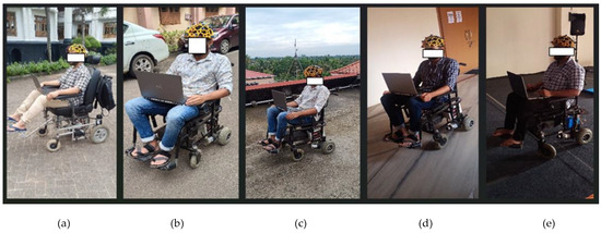 During this data recording session, the five subjects sat on three different wheelchairs and navigated over five different terrains with different surface friction coefficients for each terrain. The five different terrains were a marble floor, concrete floor, carpeted floor, interlock brick floor, and road. Each subject received the same number of motor actions to imagine in each recording session. A few images that were taken during the recording sessions are shown in Figure 9. The main motive behind this recording setup was to find the effect and changes that happen to the EEG data when the subject is in the same wheelchair but on different terrains, and on the same terrain but using different wheelchairs. This helps in creating a real-time dataset with artifacts, which is useful to validate the empirical model.