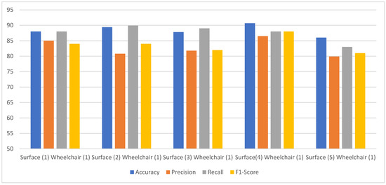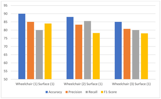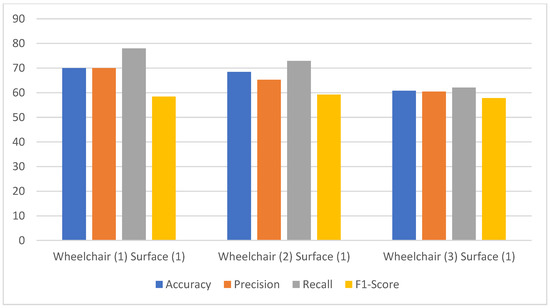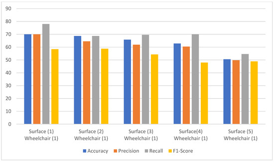 Figure 10 shows the performance metrics comparison for a subject in the same wheelchair but on different surfaces, without the empirical model as in case (a). The accuracy variation is about 20%. The highest accuracy is only 70%, and the lowest is 50.57%. This variation in the accuracy also shows the effect of noise concerning changes in the surface. The lowest accuracy was obtained for surface 5, with the highest surface friction value. Similarly, the variation in precision and recall is also observed to be about 20% for all five surfaces, whereas it is about 10% for the F1-score. But the F1-score had the lowest range of all four metrics, only ranging from 48–58%. Figure 11 shows the performance metrics without the use of the empirical model for case (b). In this case, the accuracy and precision also ranged from 60% to 70%, whereas only the recall could reach 78% for wheelchair 1. The recall could still not cross the 80% mark. The F1-score remained almost constant at 58%, which is the lowest of all the metrics.