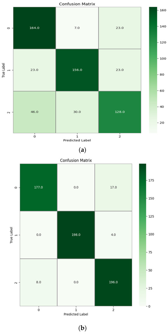 (a) The confusion matrix for a subject’s data without empirical error removal and (b) the confusion matrix for a subject’s data with empirical error removal. The confusion matrix represents the classification results for a single subject’s data, not an average across multiple subjects.