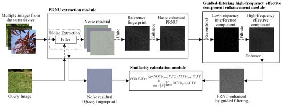 The workflow of the PRNU guided-filter enhancement algorithm proposed is shown in Figure 1. It consists of three main modules: the PRNU extraction module, the guided-filtering high-frequency effective component enhancement module, and the similarity calculation module. Among them, the guided-filtering high-frequency effective component enhancement module is the core module in this paper.