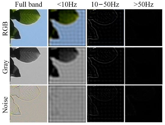 Image segmentation results across different frequency bands. The rows from top to bottom display the color image, grayscale image, and noise image, respectively. From left to right, the columns represent the full-band frequency image, the image filtered to frequencies below 10 Hz, the 10–50 Hz frequency band image, and the image filtered to frequencies above 50 Hz.