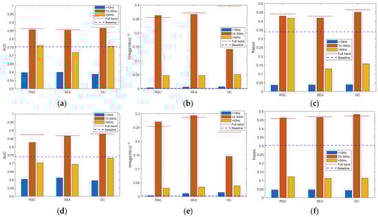 In the actual experiments, a step size of 5 Hz is employed for the frequently-by-frequently analysis. It is observed that the values of the corresponding metrics in the 0–5 Hz and 5–10 Hz frequency bands are extremely low, while each step interval within the 10–50 Hz band exhibited significantly higher corresponding metric values. In contrast, the overall metric values in the frequency band above 50 Hz are relatively low. To conserve space and highlight the key findings, the experimental results have been summarized and consolidated, as presented in Figure 5.