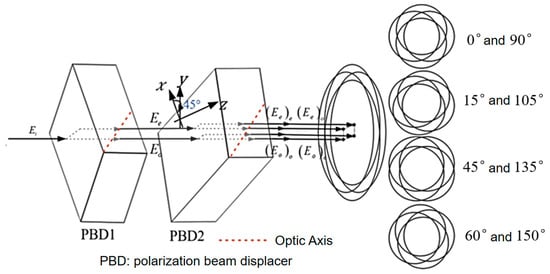 After the lateral shearing light waves pass through PBD2, the ordinary (o)-light and extraordinary (e)-light are separated into two sheared light waves in the y-direction. These two sets of light waves are then processed by the DBCs-BD orthogonal lateral shearing system, forming four linearly polarized light waves with orthogonal shear. These waves are represented as , , and , respectively. The four replicated light waves generated by the DBCs-BD system contain two sets of orthogonal overlapping polarized light beams. The polarization vectors of these four light waves are represented as , , , , respectively.
