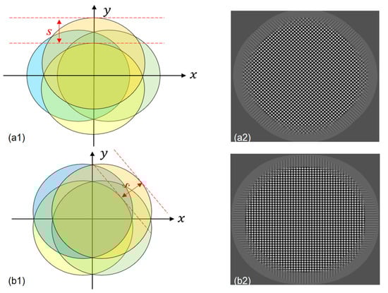 Fringe feature distribution in orthogonal lateral shearing interferometry. (a1) Wavefront position distribution map in orthogonal lateral shearing interferometry. (a2) Orthogonal shearing fringe pattern corresponding to (a1). (b1) Wavefront spatial distribution diagram with the DBC-BD system rotated 45° around the z-axis. (b2) Orthogonal shearing fringe pattern corresponding to (b1).