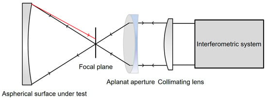 In actual testing of aspherical surfaces, parallel light emitted by the interferometric system converges to its focal point through an aplanatic aperture, generating a spherical wavefront. This spherical wavefront then reaches the aspherical surface, where it is reflected back to the interferometric system. The system directly measures the deviation of the aspherical surface from the spherical reference wavefront.