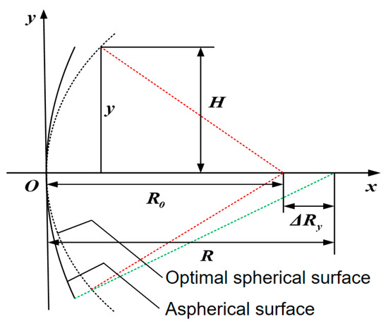 The intersection points between the aspherical normal and the optical axis vary with the height of different zones, as shown in Figure 4. Assuming that the distance from the intersection point of the paraxial normal and the optical axis to the aspherical vertex is , and the distance from the intersection point of the optical axis to the aspherical vertex in the y-direction is , the difference in normal intercept is expressed as follows: