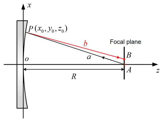 According to the theory of spatial ray tracing and the law of reflection, the spatial coordinates of point B can be obtained for the reflected light path, PB. Let the equation of the aspherical surface under test be defined as follows: