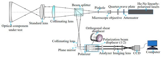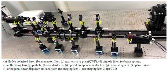 The experimental system was constructed based on the structural principle of multi-directional orthogonal lateral shearing interferometry, and the experimental setup is shown in Figure 7. The setup includes the following components: The interferometer consists of the optical component under test, a standard lens (convex lens, aperture: 50.8 mm, focal length: 200 mm, @Thorlabs Inc. Newton, NJ, USA), a collimating lens (when a collimating lens and a standard lens are used together, methods such as wavefront analysis and optimization design are employed to minimize deviations in the reference wavefront), a beam splitter, a linear polarizer, two birefringent crystals (PBD1 and PBD2), an analyzer (a linear polarizer, LPVIS100, extinction ratio: 800:1, @Thorlabs Inc.), an imaging lens (LB1596-A, diameter: Ø = 25.4 mm, focal length: 150 mm, @Thorlabs Inc.), and a CCD camera (2/3 inch Sony CMOS Pregius sensor, IMX250, resolution: 2448 × 2048, 5 MP, 75 fps, @The Imaging Source, Inc. Berlin, Germany). These components are arranged coaxially along the same optical axis. The birefringent crystals (calcite, polarization parallel plate, CN2103091401, @Union Optic Inc. Wuhan, China) are 9.28 mm thick and serve as the PBDs for the orthogonal shearing of the wave in the x- and y-directions. The lateral shearing distance introduced by the PBD is 1 mm, and the ordinary and extraordinary waves are laterally shifted by 1/10 of the incident beam aperture in the x- or y-axis direction. In addition, the interferometer includes a laser light source (HRS015B, He-Ne laser, max power: <5 mW, wavelength: 632.99 nm, linearly polarized, @Thorlabs Inc.), an attenuator filter (GCO-07 series circular adjustable attenuator, @Thorlabs Inc.), a microscope objective (magnification: ×40, NA: 0.65, working distance: 0.632 mm, focal length: 4.65 mm, field of view (FN): 0.5 mm, @Thorlabs Inc.), and a pinhole (GCO-P05A, pinhole diameter: 5 μm, seat diameter: Ø 25.4 mm, @DHC Inc., Tokyo, Japan), which, together, form the beam-expanding collimation system. These components are arranged parallel to and concentric with the main optical axis. PBD1 is oriented horizontally along the x-axis, with its fast axis aligned at 0° to the x-axis. PBD2 is rotated 45° along the y-axis relative to PBD1. The orthogonal shearing waves produced by the PBDs are laterally sheared in the orthogonal direction and undergo interference when passing through a 45° or 135° analyzer.