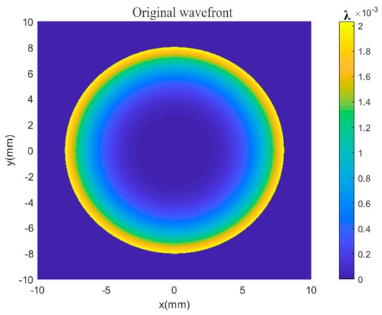 The initial aspherical wavefront expression for the simulation is given by Equation (41), in which, the spherical parameters and are defined, respectively. The original wavefront was simulated using MATLAB as shown in Figure 8.