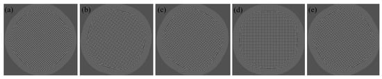 Simulation results of orthogonal lateral shearing interferograms: (a) 0° and 90°, (b) 15° and 105°, (c) 30° and 120°, (d) 45° and 135°, and (e) 60° and 150°.