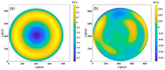 To improve the measurement accuracy by fitting large amounts of data and simplifying the analysis of complex surface geometries, the integral minimization method and multi-segment stitching are used for aspherical surface testing and wavefront reconstruction. The integration minimization method [21], based on the least squares principle, aims to find a wavefront expression that best fits the data by minimizing the difference between the measured wavefront slopes and the theoretically calculated slopes. The result of this reconstruction is shown in Figure 27a. Factors such as data accuracy, choice of polynomial basis functions, and calculation stability can affect wavefront reconstruction quality.