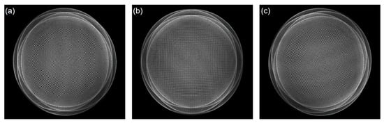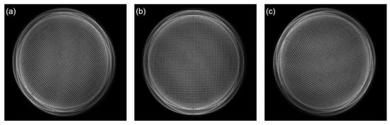 The fringes pattern distribution of multi-directional orthogonal lateral shearing interferometry is shown in Figure 2. This technique allows for lateral shearing interferometry in two orthogonal directions simultaneously, enabling the measurement of the wavefront’s spatial position distribution across four polarization components detected at the imaging plane. However, shearing interferometry is used to measure the deviation of the wavefront under test. By analyzing the interferometric fringes on an aspherical surface, the wavefront deviation of the surface can be obtained. For non-rotationally symmetric wavefronts, lateral shearing interferometry requires two fringe patterns. Due to the complexity of the fringes on the aspherical surface, wavefront reconstruction is necessary to determine the aberrations caused by the surface. High-precision testing with lateral shearing interferometry requires precise knowledge of both the shear amount and shear direction. It cannot achieve high-precision wavefront testing with large deviations. Therefore, this method is most effective for testing aspherical surfaces with small deviations.