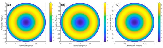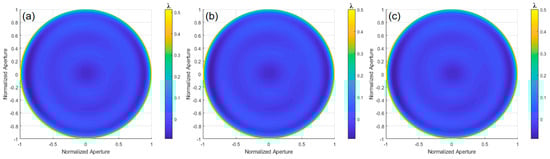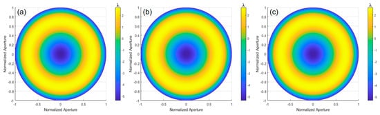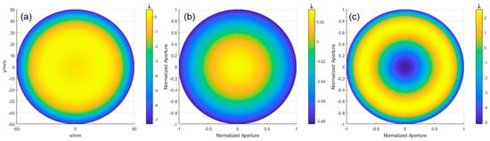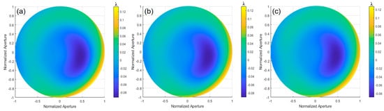 In the investigation of aspherical wavefront, simulation calculations were performed with k = −1, R = 606, and aperture D = 90. These parameters yield the wavefront deviation between the ideal aspherical surface and the optimal spherical surface. According to Equation (31), the radius of the optimal comparison spherical surface is 606.845 mm. Using the ray-tracing model, the OPD was fitted with MATLAB, as shown in Figure 11a, where the PV value is 2.086λ and the RMS value is 0.608λ. The defocus error in Figure 11b has a PV value of 1.853λ and RMS value of 0.534λ. The wavefront deviation, obtained by subtracting the two, is shown in Figure 11c, with a PV value of 0.998λ and RMS value of 0.275λ.