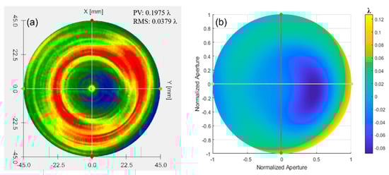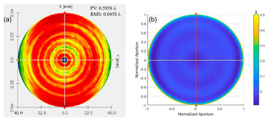 To calculate the machining error of the aspherical surface relative to the design value, the measured value is compared with the design value. In the previous study, the ray-tracing method was used to calculate the OPD, and the deviation value of the ideal paraboloid surface relative to the optimal spherical surface was obtained through the MATLAB simulation, as shown in Figure 11c. By subtracting the two values, the deviation of the paraboloid surface relative to the ideal paraboloid surface can be determined. Figure 12b shows the wavefront deviation of the paraboloid surface obtained by orthogonal lateral shearing interferometry, with a PV of 0.097λ and an RMS of 0.026λ.