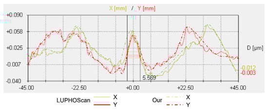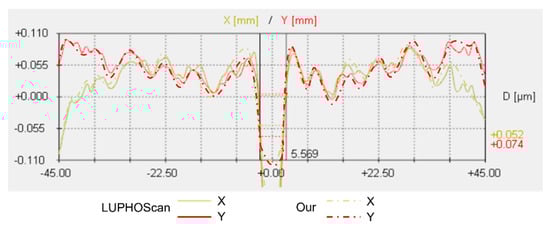 The Luphoscan, a non-contact 3D optical surface profilometer with the highest testing accuracy, was used to scan the paraboloid surface. The deviation of the surface under test relative to the ideal paraboloid was determined based on the measurements of an aspherical surface with a 4 μm asphericity. The measured result from the Luphoscan is shown in Figure 23a, while the testing result from multi-directional orthogonal lateral shearing interferometry is shown in Figure 23b. Profilograms were generated from the digital data arrays, as shown in Figure 24.