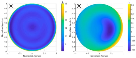 The OPD calculated using the ray-tracing method result in defocusing due to the difficulty in accurately determining the OA distance. In theory, the OPD is the sum of the retrace error and the defocus caused by the deviation of the ideal aspherical surface from the optimal spherical surface. Therefore, the retrace error caused by asphericity can be obtained by subtracting the defocus from the OPD. Therefore, Zernike polynomials can be used to fit the OPD. To model this, Zernike polynomials can be used to fit the OPD. Due to their orthogonality on normalized unit circles, Zernike polynomials provide a good correspondence with optical aberrations. Thus, any wavefront deviation can be expressed using Zernike polynomials as follows: