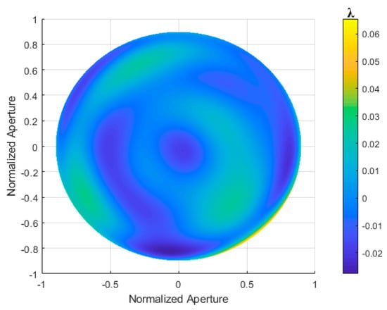 To verify the accuracy of the aspherical surface testing system with retrace error correction, a simulated light source with a wavelength of 632.8 nm was used. The aspherical surface has the following parameters: cone constant k = −1, aperture D = 90 mm, curvature radius of the vertex spherical surface R = 606 mm, a high-order coefficient = 0 for the concave paraboloid surface, and an axial distance d = 606.8354 mm. The aspherical surface has an additional surface error with a PV value of 0.0973λ and an RMS value of 0.0267λ, which represents the original wavefront error Ws of the aspherical surface, as shown in Figure 28. The calculation results for the simulated aspherical surface are shown in Figure 29.