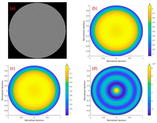The orthogonal lateral shearing interference pattern, obtained through simulation, is shown in Figure 29a, and the original wavefront from ray tracing is shown in Figure 29b. The simulation interferogram was demodulated using the wavefront reconstruction algorithm based on a multi-directional orthogonal differential Zernike polynomial, and the reconstructed wavefront is shown in Figure 29c. The residual error is shown in Figure 29d.