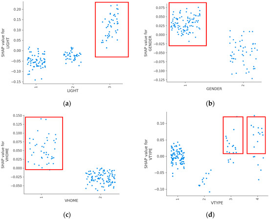 Figure 3 shows the details of the feature contributions of the top ten features. The results indicate that darkness–unlighted, male, non-Beijing motor vehicle license, truck and bus, summer and autumn, weekend, suburban, No signal and Other security facilities, normal road, and front impact crashes produce a higher probability of fatal crash occurrences.