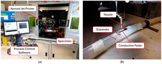 Figure 1. Overview of the Aerosol Jet Printing process: (a) the equipment used for sensor printing, the red box indicates the printing area and (b) an example of a tube undergoing the printing process.
