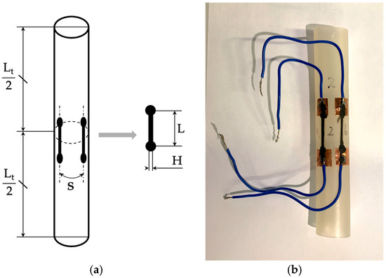The sensor ends were connected to copper sheets glued to the tube, onto which the electrical wires used for resistance measurement were soldered. An example of a completed specimen is shown in Figure 2b.