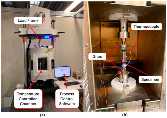 Figure 3. The load frame used for tensile tests on specimens: (a) the machine with the temperature-controlled chamber and (b) a detail of a specimen positioned with proper grips. The thermocouple used for temperature monitoring is also visible.
