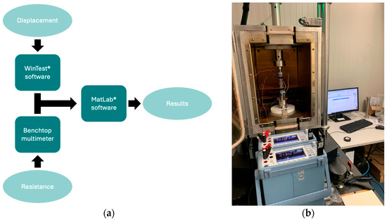The overall scheme of the measurement chain configuration is shown in Figure 4a. The displacement values ∆L, imposed on the specimens by the load frame, were recorded directly by the proprietary software of the machine (WinTest®, v.8.3). In addition, two-wire resistance measurements were carried out by a benchtop multimeter (Yokogawa DM7560, Yokogawa Europe B.V., Amersfoort, The Netherlands) to collect resistance values simultaneously from both AJP-based sensors. The signals were acquired on USB memory in two separate files (.csv) and then imported into MatLab® (v. 9.14.0) for post-processing operations. Figure 4b provides an overview of the measurement chain used for data acquisition.