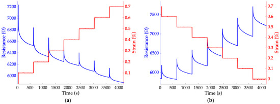 In Figure 5, an example of the sensor response to the application of static strain steps can be observed, both in the loading and unloading phases (Figure 5a and Figure 5b, respectively). It can be noted that during the application of the steps ∆ε, there is always an increase in resistance. Then, when the input strain remains constant, the resistance decreases, following an exponential law. This behavior is known in the literature as ‘overshoot’ [37], and its magnitude is directly proportional to the strain value and strain rate for the same material [38]. This phenomenon highlights the viscoelastic nature of the specimens [34,35].