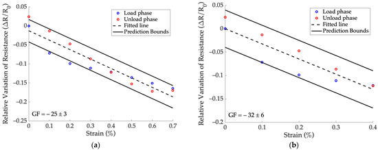 As described above, the sensor transfer function was derived by the weighted least squares fit applied to variations in the relative resistance measurements as a function of the imposed strain. The weights were assessed as the inverse of the variance of the relative resistance variation values, combining the contributions in Section 6.2 with the repeatability contribution estimated from the load–unload cycles. Prediction bounds were estimated by considering the uncertainties of the coefficients obtained from the linear regression model. Specifically, they were assumed as the maximum interval between the two extremal lines of the pencil of lines derived from the regression coefficients and their uncertainties.