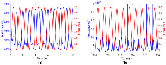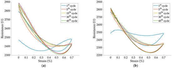 Figure 7 shows the behavior of a sensor subjected to cyclic strain loading in the range of 0.0 to 0.7% at frequencies of 0.01 Hz (Figure 7a) and 0.1 Hz (Figure 7b). It can be observed that the sensor required at least ten preconditioning cycles before reaching a stable behavior.