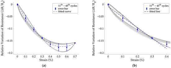 The change in resistance within the strain range of 0.0 to 0.7% does not appear linear. This hypothesis was confirmed by the fact that fitting the trend with a second-order polynomial (Figure 8a) yields an R2 coefficient > 0.99. Therefore, in this case, the weighted linear least squares regression was carried out only for strains up to 0.4% (Figure 8b).