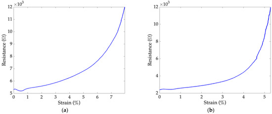 In Figure 9, the sensor response in the strain range between 0.0–1.0% is shown. Indeed, at first, the resistance increased, then decreased for a limited interval, and then increased again. This behavior, described in [40,42], depends, among other factors, on the percentage of carbon particles within the conductive paste. It would be interesting to impose a pre-tensioning on the sensors before their testing to obtain a more stable behavior of the sensors for a wider strain range.